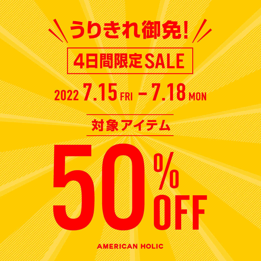 2022-07-18 【本日まで】期間限定SALE! このメールが正しく表示されない場合やWebページとして表示するにはこちらをクリックして下さい。 AMERICAN HOLICからのお知らせ ポイントカードに関する重要なお知らせ 主要3キャリアの新料金プランへご変更の方へ ・・・・・・・・・・・・・・・・・・・ コロナの影響による各店の営業に関しては 各館のHPをご参照ください。 近隣店舗が休業の場合は、 ぜひオンラインストアをご活用ください。 ・・・・・・・・・・・・・・・・・・・ 本日最終日!! \うりきれ御免!/ 4日間限定SALE 7.15(金)-7.18(月・祝) 対象アイテム ★★50%OFF★★ お買い得なアイテム 多数ご用意しております! ぜひこの機会をお見逃しなく ♪ ・ ・ ※オンラインストアとは一部価格が異なる場合がございます。 ※内容は予告なく変更になる場合がございます。予めご了承くださいませ。 >オンラインストアでも同時開催中! 7/22(金)12時30分ライブ配信スタート♪ ブランド公式Instagram・STLIVE(STRIPE CLUBライブコマース)にて 「美・美・美ポンチフレアパンツ」の こだわりポイントとおすすめコーディネートを詳しくご紹介します。 ご質問にもその場で回答します。 ぜひご覧ください! >公式インスタグラムはこちら! 【新型コロナウイルス感染拡大防止対策として】 新型コロナウイルス感染拡大防止のため、 当面の間下記対応を実施してまいります。 ▼▼▼ 1. 店舗スタッフ全員マスクを着用いたします。 2. 店内が混み合う場合は、 入場制限をさせていただく場合もございます。 お客さまとスタッフの安全を考慮した上での 対応となりますことをご理解いただけますと幸いです。 早くこの事態が終息し、お客さまに安心して お買い物を楽しんでいただける日が来るよう心から願うとともに、 今私たちでできる限りの対応をしてまいります。 今後ともAMERICAN HOLICをどうぞよろしくお願いいたします。 ※このメールは、送信専用メールアドレスから配信しており、 ご返信いただいてもお応えできませんのでご了承ください。 メールマガジンの配信停止はこちら STRIPE INTERNATIONAL INC. (c) All Rights Reserved.