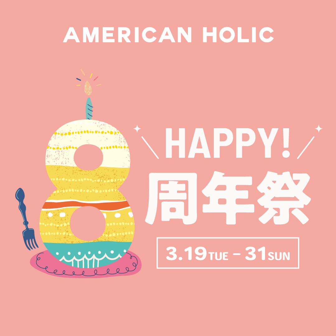 2024-03-18 【告知】アメホリ誕生8周年祭開催! このメールが正しく表示されない場合やWebページとして表示するにはこちらをクリックして下さい。 AMERICAN HOLICからのお知らせ \AMERICAN HOLIC8周年祭開催/ 3.19(TUE)-3.31(SUN) AMERICAN HOLIC誕生8周年! 日頃のご愛顧に感謝の気持ちを込めて、 お得なアイテムをご用意しました。 ぜひこの機会にショッピングをお楽しみください。 ★オンラインストアでも開催予定★ 3.19(TUE) 9:00-3.31(SUN)23:59 ※店舗とオンラインストアでは商品の価格が異なる場合がございます。予めご了承ください。 ※内容は予告なく変更になる場合がございます。 >オンラインストアはこちら ※このメールは、送信専用メールアドレスから配信しており、 ご返信いただいてもお応えできませんのでご了承ください。 メールマガジンの配信停止はこちら STRIPE INTERNATIONAL INC. (c) All Rights Reserved.