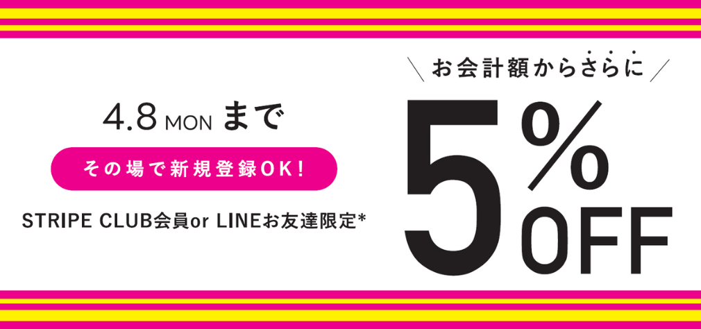 2024-04-06 【グリーンパークス】春本番!お出掛けにおすすめのトップス¥2,490(税込)〜、アウター¥3,990(税込)〜 Green Parksからのお知らせ \お得がいっぱい♪/ これから活躍の『春アイテム』が早くもお得に! おすすめをPICK UP♪ この機会をお見逃しなく★ ≫詳細はこちら SPRING OUTERCollection 季節の変わり目にマストアイテム! ベーシックからデザインアイテムまで バリエーション豊富にご紹介♪ ≫まとめてCHECK!! ≫ VIEW MORE \店舗限定!/お会計額から5%OFF♪ 3.15 FRI -4.8 MONSTRIPE CLUB会員様またはLINEお友達限定**STRIPE CLUB公式LINEアカウント お会計額からさらに★5%OFF★ 新作はもちろん、SALEアイテムはお値下げ後からさらにおトクに!ぜひご来店お待ちしております♪ 店舗一覧はこちら ※一部対象外商品あり※本キャンペーンは店舗限定の為、オンラインストアでの実施はございません。※一部店舗で実施していない場合がございます。詳しくはお近くの店舗へお問い合わせください。 PICUP ITEM 『今』から取り入れたい SPRING GOODS今から長く楽しめる春小物をPICK UP! ≫ VIEW MORE ≫ Green Parks TOP ※このメールは、送信専用メールアドレスから配信しており ご返信いただいてもお応えできませんのでご了承ください。 メールマガジンの配信停止はこちら STRIPE INTERNATIONAL INC. (c) All Rights Reserved.